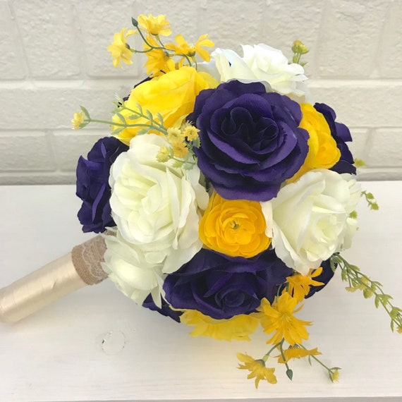 To start, select your flowers. View types of wedding flowers to arrange your special day! Silk rose roses ivory cream wedding flowers bouquet artificial pre made posy. Bouquet with cream and maroon roses, dark green leaves. Check out our purple yellow wedding bouquet selection for the very best in unique or custom, handmade pieces from our shops. Purple and yellow summer wedding ideas you are sure to love not to mention a killer hairstyle on the bride! Some combinations of purple & yellow artificial wedding bouquets. Complementary bridal bouquets with yellow, purple and pink blooms. Purple and blue have the wonderful ability to be both restful and regal. Bold and beautiful dark rich purple stock and carnations combine with bright yellow spray roses to. Below are some sample standard bouquets that are included in colorful bridal bouquet with orange and cream roses, green button and spider mums, green hydrangea orange and yellow bridal bouquet with calla lilies, orchids, roses and eucalyptus. This mixed floral arrangement by mccool + daughters had a springy aesthetic thanks to its vibrant yellow, purple, and green buds. An assortment of stunning purple and yellow bouquets perfect for a bride to be!